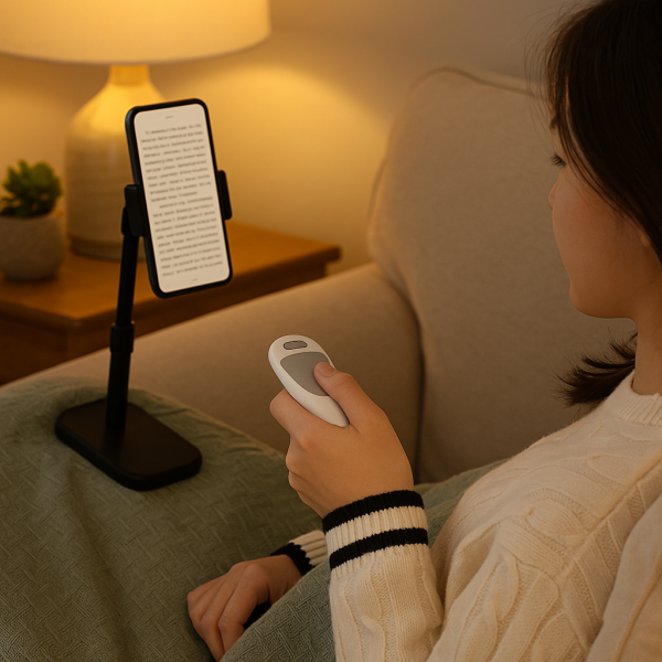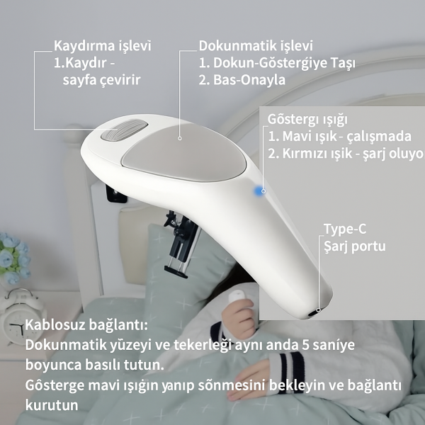 Telefon veya tabletinizi elinize almadan sayfaları çevirmek, videolar arasında geçiş yapmak veya prompter uygulamanızı kontrol etmek artık çok kolay! Mini Telefon Mouse ile tek parmak hareketiyle cihazınızı yönetebilirsiniz.